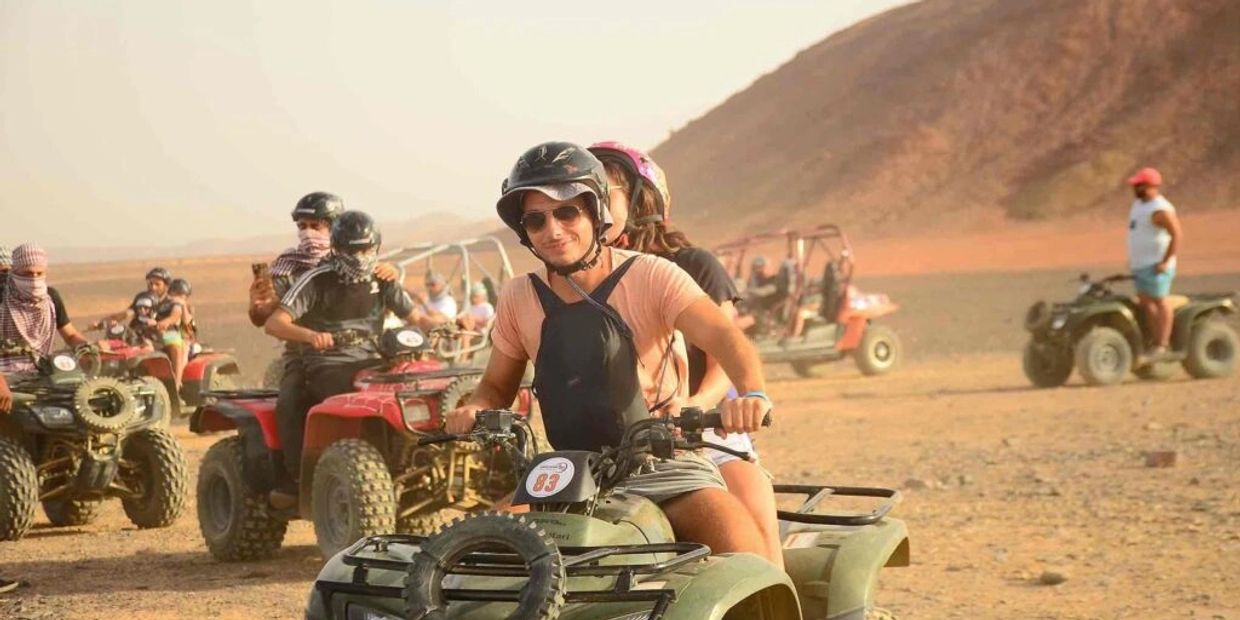 A ride with Moto Safari ATV is an exciting two-hour ride through the desert, one of the most popular excursions among Egyptian and foreign tourists. It gives unforgettable adrenaline feelings, excitement, and amazing photos for memory. The ATV has only two controls on the handlebars - gas and brake, so it is very easy to operate without special training, and a driver's license is not required. Even teenagers as young as 16 years old can drive it on their own. The four wide wheels allow the ATV to be stable and safe enough for desert riding. Guides accompanying tourists always ensure the safety of the movement of the group.